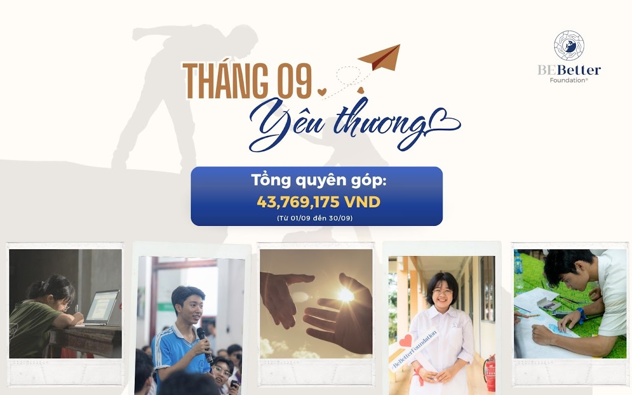 Và trong tháng 9 vừa qua, Be Better đã nhận được 43.769.175 đồng từ những tấm lòng yêu thương của Quý vị. Be Better xin đón nhận với tất cả sự biết ơn và trân quý, vì tình thương quý nhà hảo tâm dành cho thế hệ tương lai và niềm tin mà Quý vị dành cho những giá trị Be Better đang theo đuổi, thông qua hai dự án: