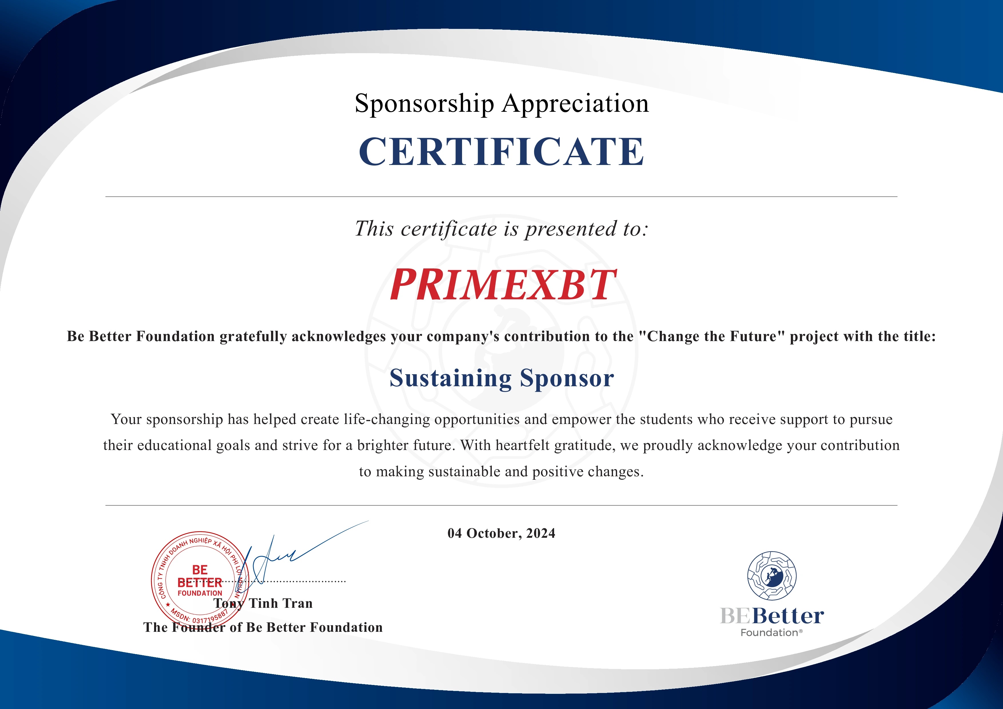 On October 4, 2024, the Be Better Foundation was honored to receive a charitable donation from PrimeXBT. With this event, PrimeXBT has officially joined us as a Sustaining Sponsor.